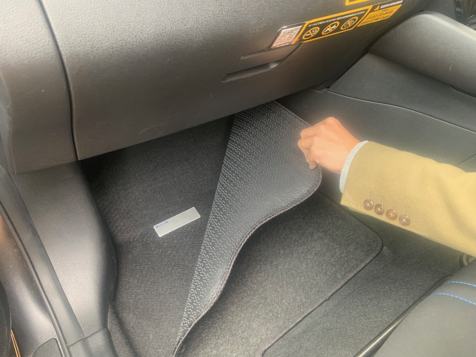 本品を助手席のフロアマットの下(前側辺り)に置く。